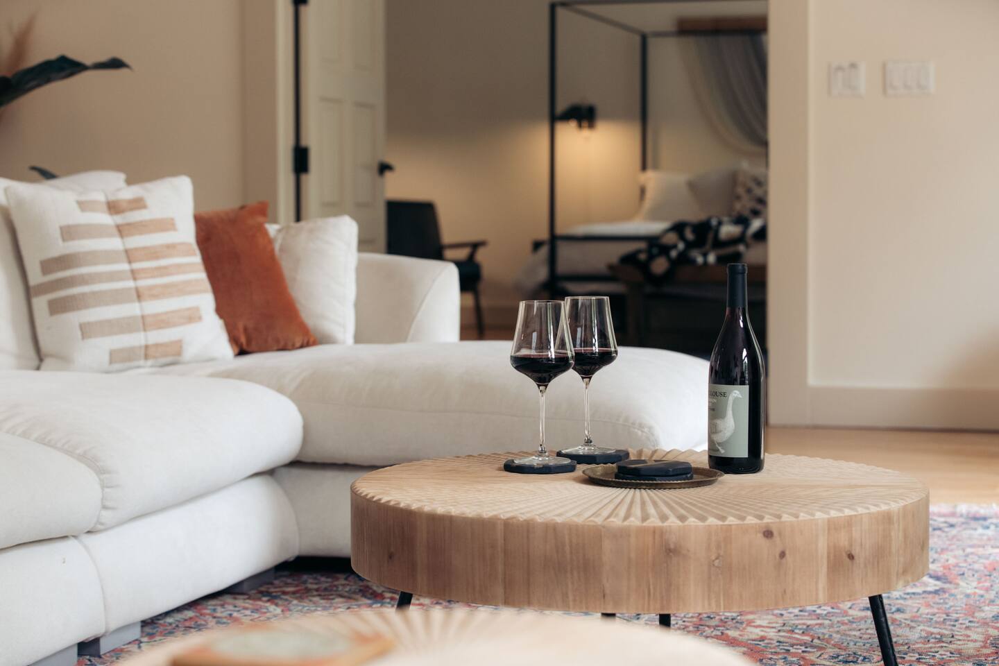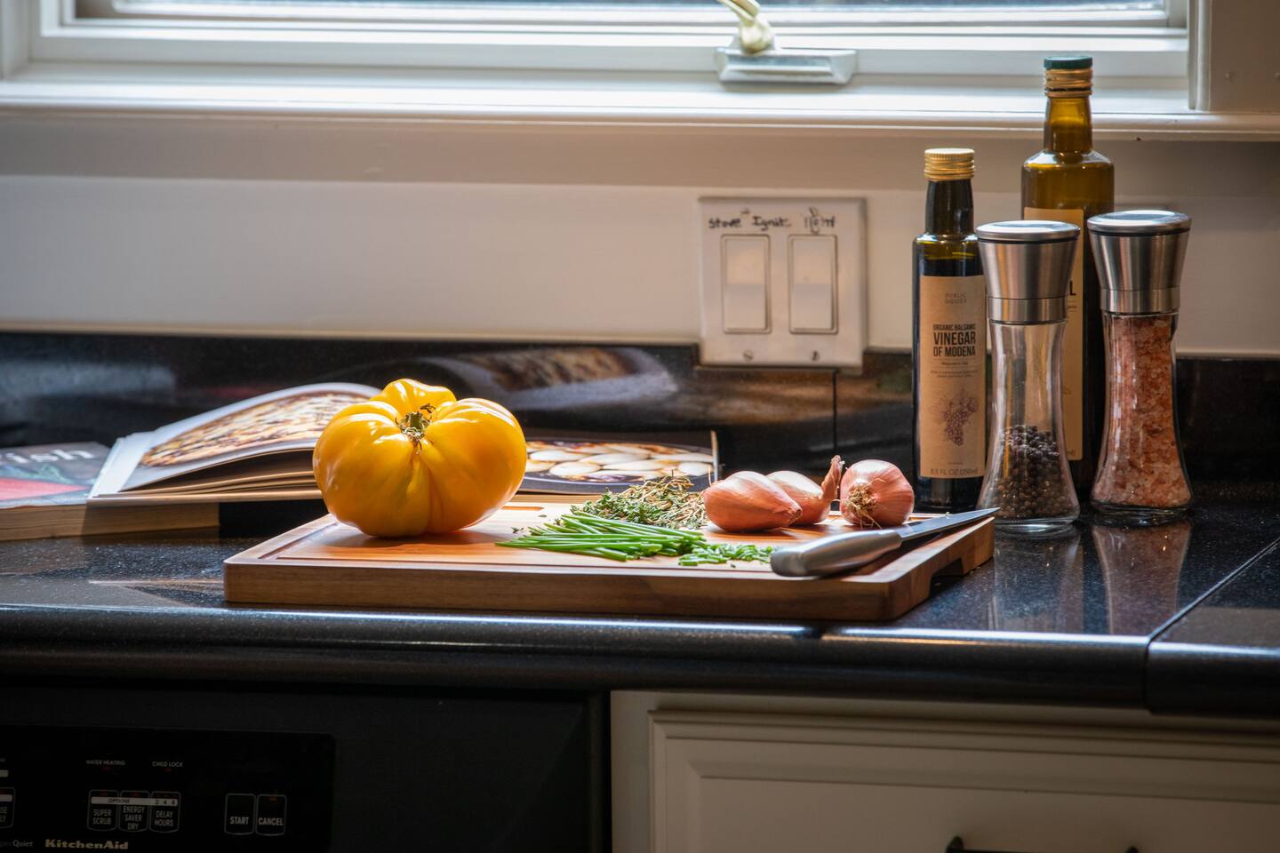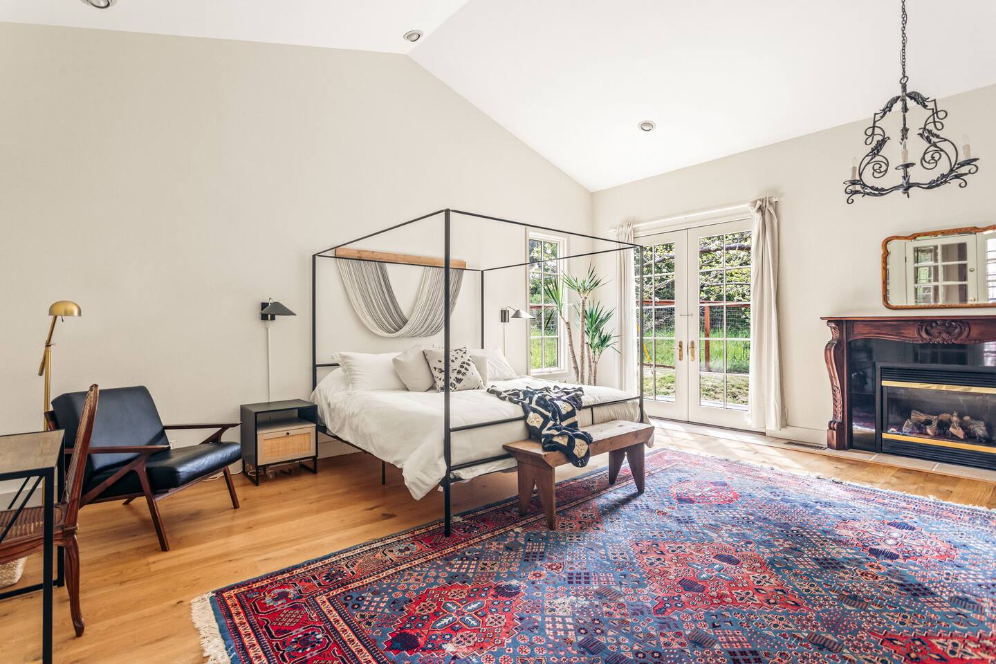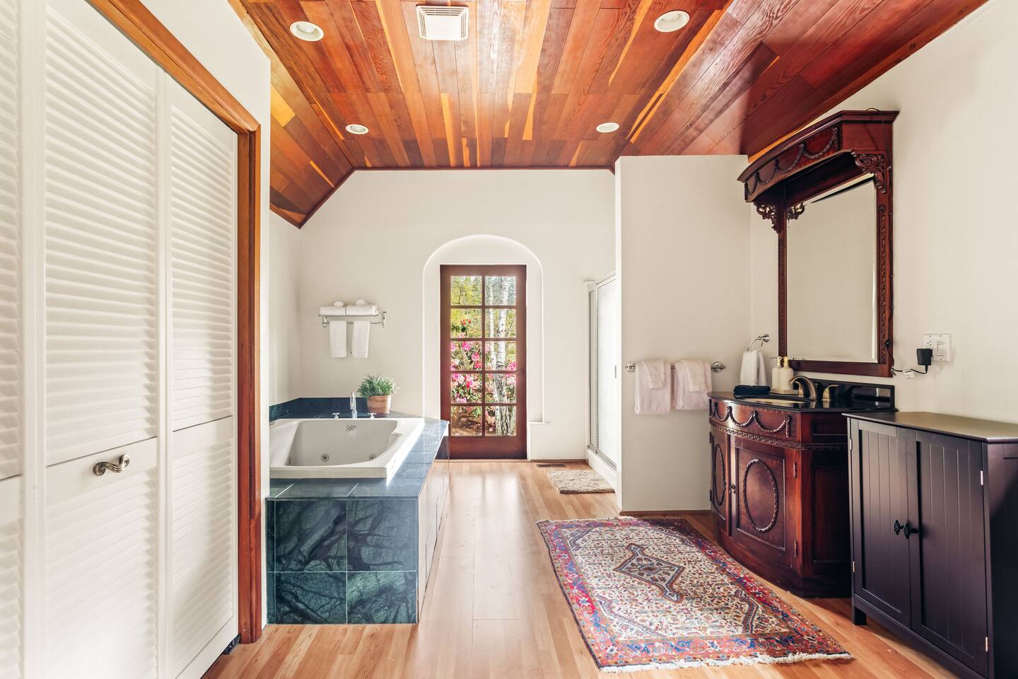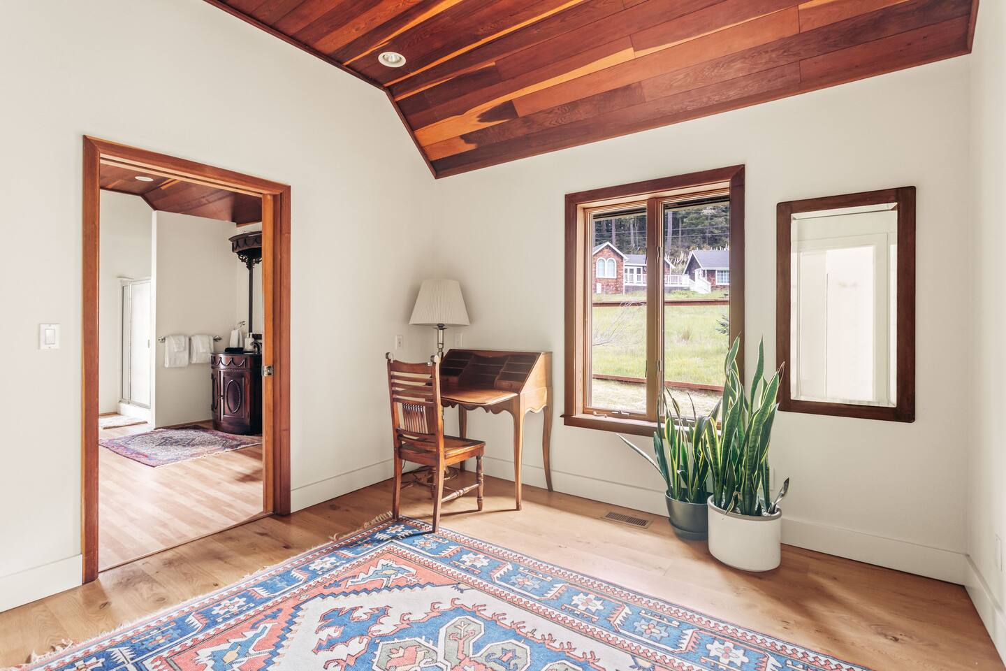 Walk up the brick pathway to enter a spacious well-appointed kitchen with cozy breakfast nook. Step up into the lovingly decorated high-ceilinged Great Room. Family heirloom carpets, treasured eclectic art, huge south facing windows, and a gargantuan couch to fall into—this environment is designed for you to unwind. Gather around the large fireplace with games and books, both of which abound in the library. The bedrooms open onto different decks through private French doors and share a bathroom with separate access points. The primary bedroom has its own gas fireplace, writing desk, and cedar lined closet. Soft robes, slippers and plenty of extra blankets are provided. We provide organic coffee, tea and a few tasty food items in case you’re arriving late. Despite the main home feeling very private, the building includes an adjacent unit and office separated by walls, secure doors and some soundproofing. Note that sound can travel between the walls. Please pay particular attention to noise in the kitchen if you’re in there during quiet hours, as sound travels to the room above. The owners live and work on site and host other guests.