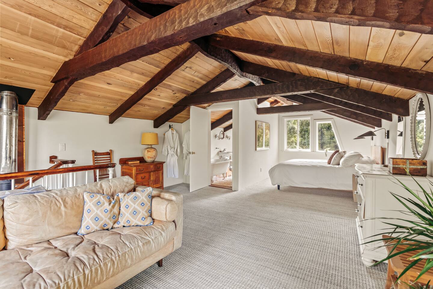 Let yourself unwind in the gorgeous coastal lands of Mendocino as you're tucked away in a spacious loft apartment made for relaxation. We’ve designed a large studio space with fluffy linens, handmade textiles, and natural touches to delight you. Walking distance to the beach, sunset views, a restaurant and store--it's a perfectly-situated restful nook on the coast. If you love a clawfoot tub, this place is for you (there is a comically-short shower intended only as a backup).